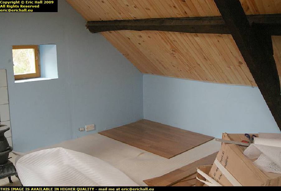 Here you can see the flooring almost all finished now. And also a roll of the space-blanket insulation that I've been using. It's excellent stuff and worth its weight in gold. Remember that there is no door or wall to the stairwell and even when there was no floor in the room the temperature reached a full degree higher than in my little room.