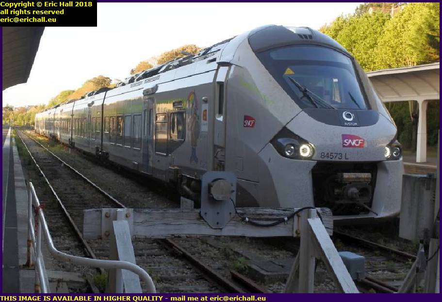 SNCF gare de granville railway station manche normandy franceThe train that we should have caught is the “return” from Argentan but that was running 50 minutes late so they prepared an idle multiple-unit standing in a vacant platform. Even so, we were still 20 minutes late leaving. And as it was a 6-car unit instead of a 12-car unit we were crammed in there like sardines too.