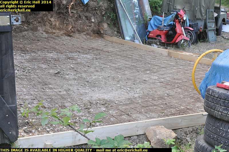 We went off to the quarry after lunch to arrange the concrete delivery, but it won’t be here until Thursday morning so we came back and fitted the reinforcing grillage. That’s necessary with a 150mm thickness of concrete. Terry then went off nd I carried on ripping out the weeds from where the towing dolly is kept.