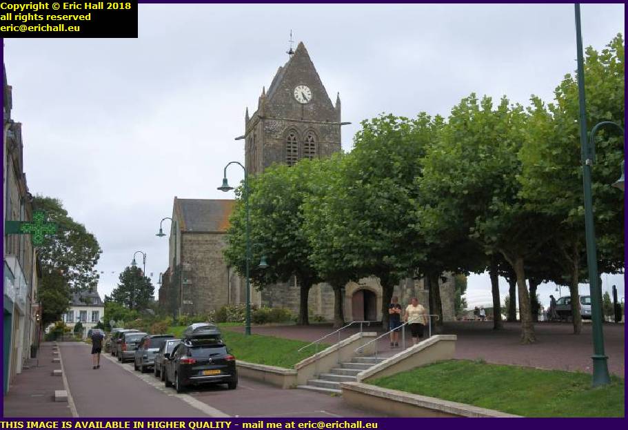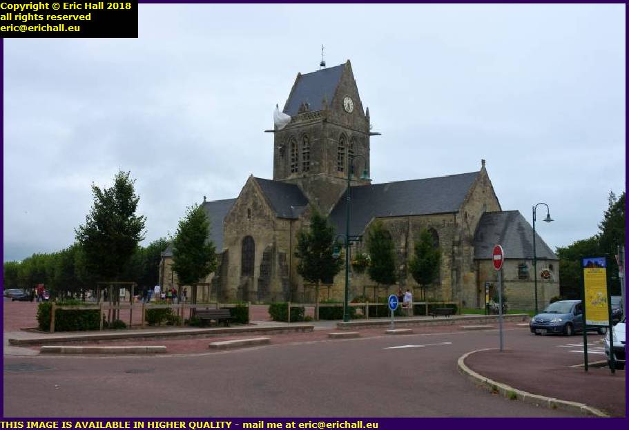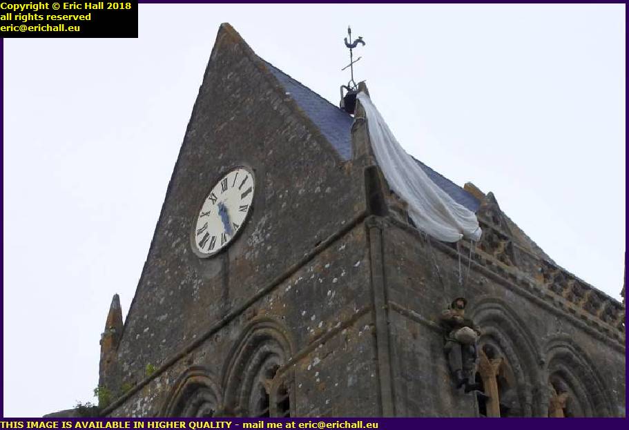 One unfortunate soldier landed on the roof of the church and as he slid down, his parachute was caught on one of the gargoyles.