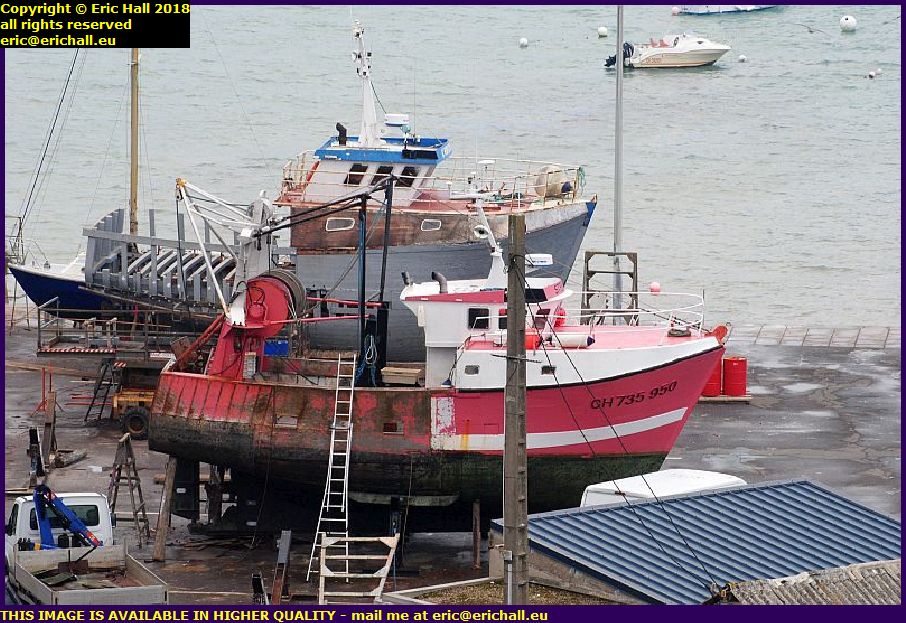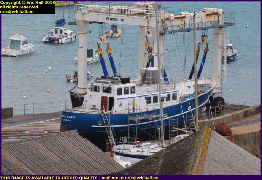 It seems that the mystery of why the Aztec Lady has turned up in Granville has been resolved. Here she is, in the shipyard, up on blocks like the rest of the ships in here.