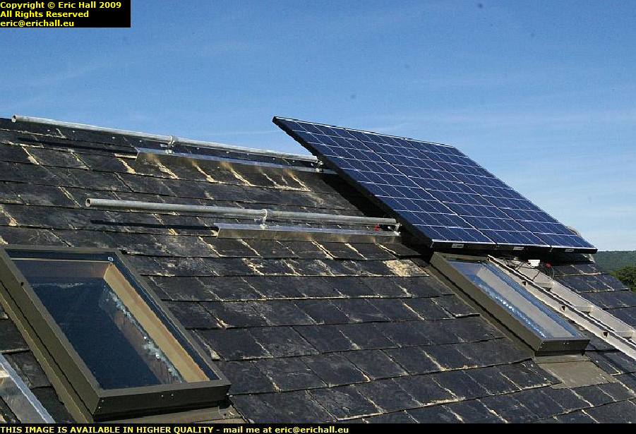 We had a rethink about the design of the framework. Solar panels are most effective when offered perpendicularly to the sun at the shortest day of the year. Here in central France that’s about 68 degrees. But being restricted by the roof windows, the panels are having to overhang the apex of the roof as you can see. And setting them at 68 degrees would have this huge sail-effect over the roof catching the stormy north winds head-on. It’s for that reason that I’ve set them parallel to the roof slope – to make sure that they don’t catch the wind so much.