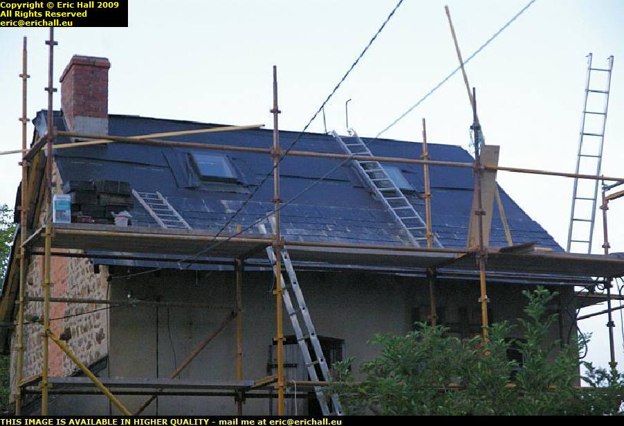 It was a blinding hot summer’s day and the heat was intense. And here we were, handling black slates made from recycled plastic whilst leaning on a black rubberised sheet of damp-proof membrane. By early afternoon Terry had resorted to gloves to handle the slates and I, leaning on top of the damp-proof membrane, had resorted to building a ladder-bridge to keep my body off the roasting surface. You can see the ladder on the left of the roof.