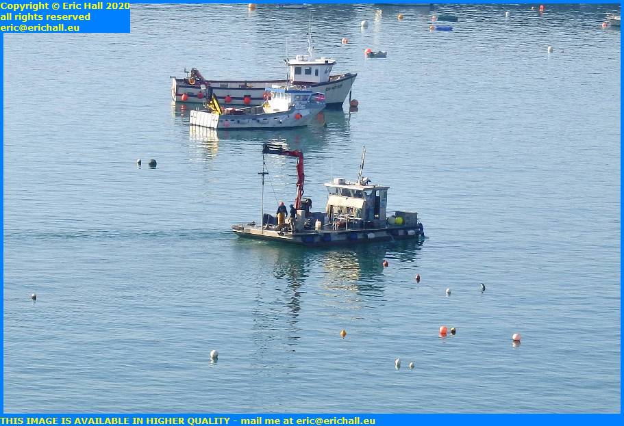 It’s some kind of pontoon or raft of some description with a cabin and a crane and several buoys on board. It looks as if it might be doing something with the mooring chains in the tidal harbour.