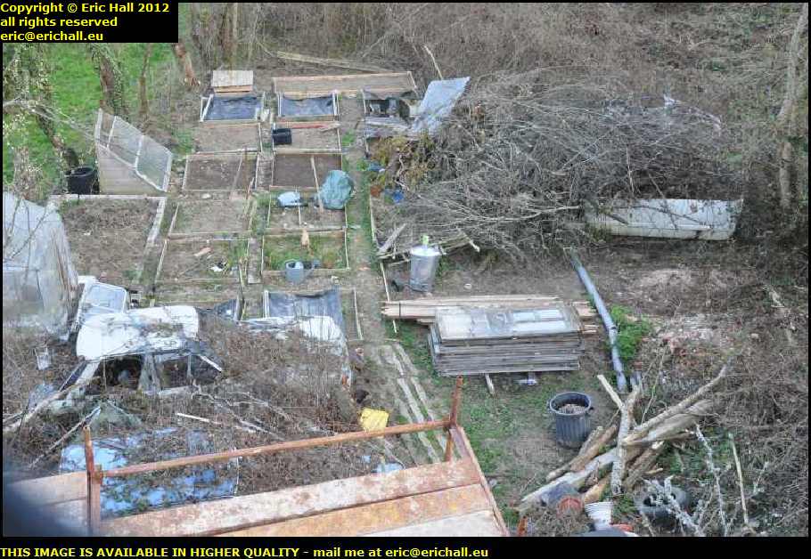 Down the right-hand side you can see the land that I cleared a couple of weeks ago when I had my garden fire The framework for the greenhouse and the windows to fill in the framework are there as you can see.