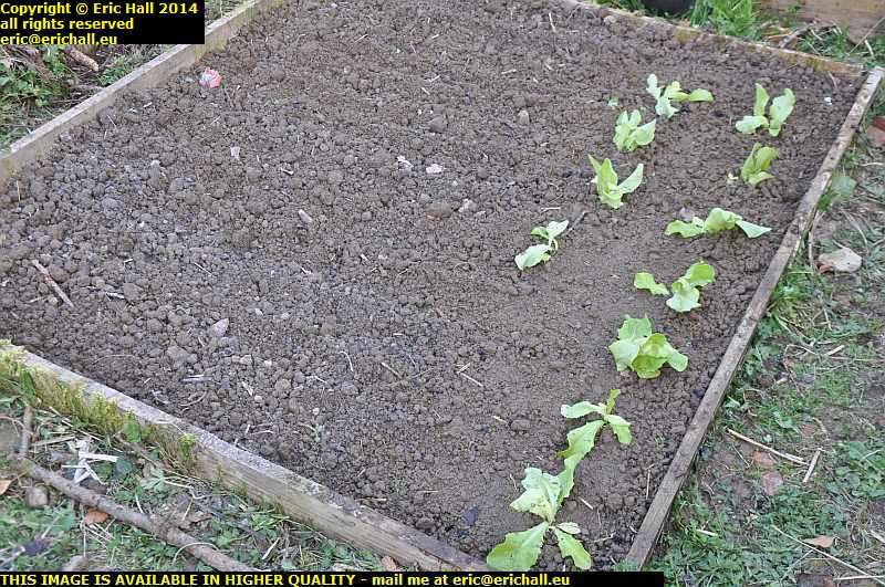 I’ve finished weeding and digging over that first raised bed. It took hours but there it is. It’s had potash added and that has been well-hoed and well-raked in. And ow it has the 11 (not 10) baby lettuce plants added. They’ll do well there.