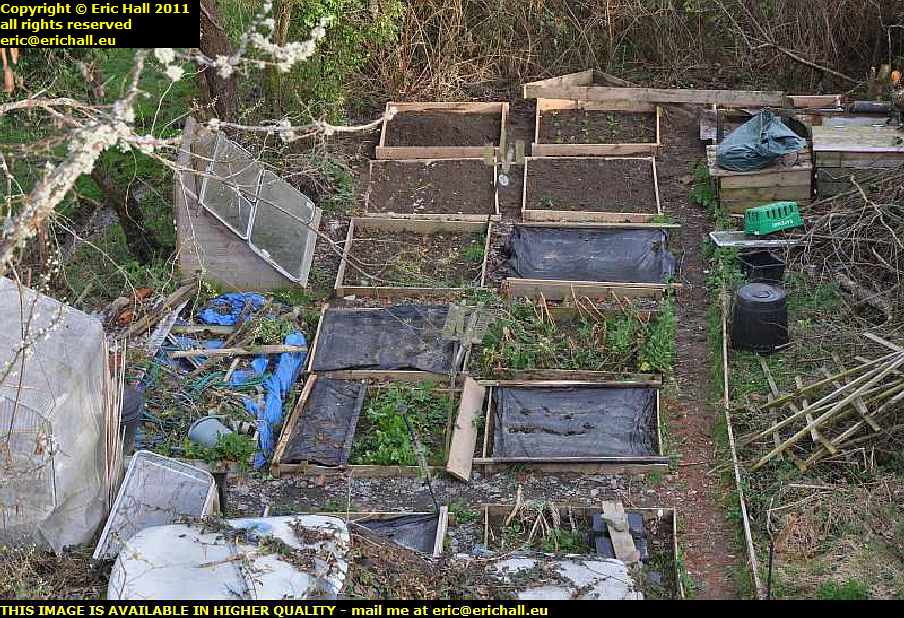 And then I made two frameworks for some more raised beds, pulled up the large one that I made to fill a gap last year, laid these two down and dug them in. And that took ages as well for much of the soil where these beds are is virgin soil, full of roots and thistles and brambles and so on.