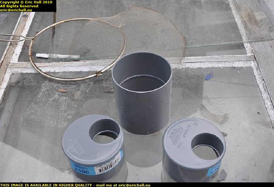 rainwater harvesting home made rainwater filter les guis virlet puy de dome franceAnd back home I started work on part one of the patent water filter system (and I would have done part two too but Terry forgot the puzzolane). Part one consists of a length of 40mm downspout, a reduction plate from 40mm to 100mm, a length of 100mm pipe, another reduction plate back to 40mm, a section from an old stainless steel mesh kitchen strainer and another length of 40mm pipe into the water butts. This first filter takes the place of the sump (the stones and the like sink to the bottom of the 100mm pipe) and the mesh filter inside the water butt.
