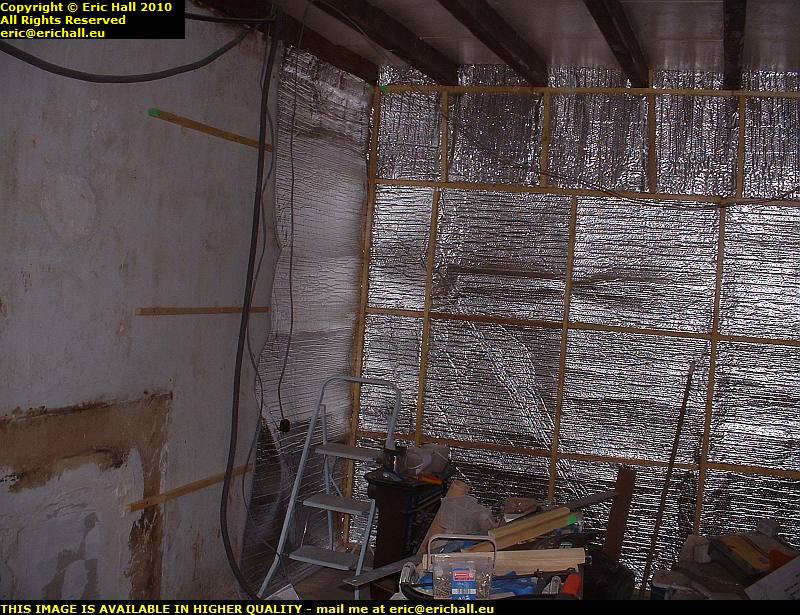 … in the bedroom. I’ve put the first layer of battens on the left-hand wall, added another strip of insulation (the last I have as it happens so I need to buy some more) and put all of the counter-battens on the back wall.