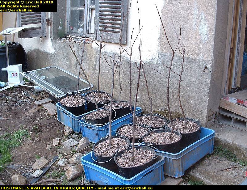 It’s not as if I’ve done anything major either, so I don’t understand it. This morning I finished off repotting the Liz Ayers memorial orchard – the trees are now all in fresh soil with a light scattering of wood ash over the topof the soil and covered in gravel to prevent weeds from settling. The bottoms of the plastic buckets have been crocked to allow for drainage.