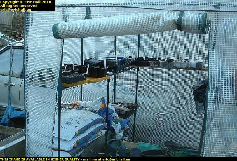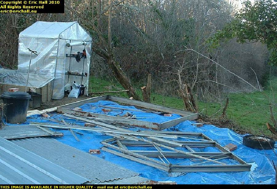 This afternoon I extracted the bits of aluminium greenhouse from the shrubbery. This is one that someone gave me – it’s a 3×2 metre with no glass so I need to organise that somehow, and I also need to find some of the aluminium screws and nuts to fasten it together. But at least I have it in place (which meant that I had to saw away several inconvenient branches) so I can work out where to put the next beds.