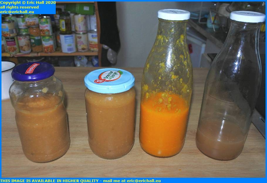 Two large glass jars were steamed in the microwave (a little water put in them and they were heated for a minute) and the tops boiled in water. The purée was then ladled into them, the lids put on and they were left to cool.