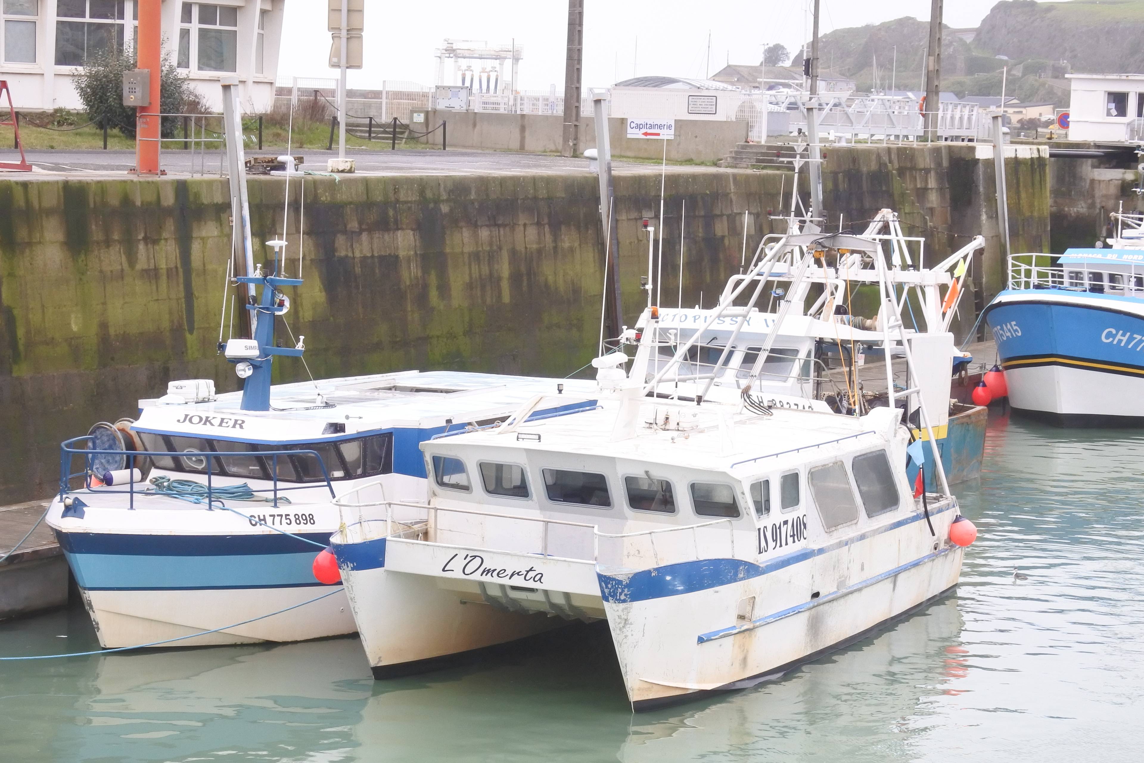 They must have just opened the harbour gates because there are three trawlers down there unloading their catch, and a whole fleet of vans and lorries waiting to take away the produce.