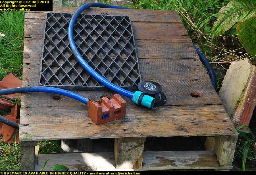 It’s an intake pipe wedged into a hollow brick (which acts as a weight when I throw it into the solar tank) and which is connected to the intake of an old caravan footpump that is fastened onto an old pallet.