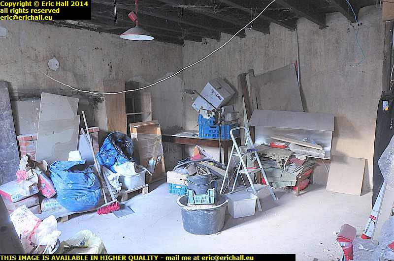 I spent the morning cleaning out an area of the floor and I’ve put two old pallets against the old chimney and stacked the bags of cement and plaster on there to keep them off the ground. So now I can start to move things around.