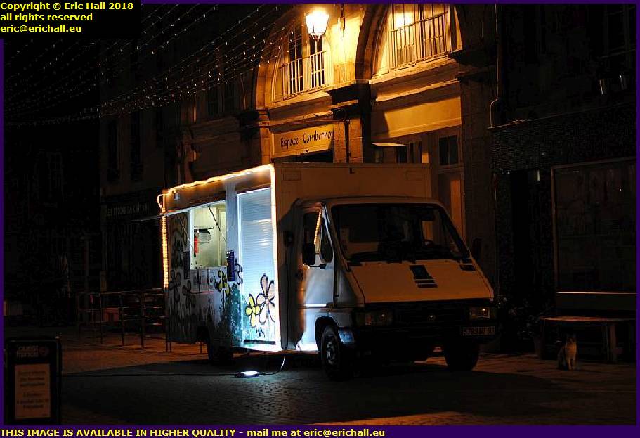 It’s Thursday night as well, and the Pizza van is there tonight. And with the tables of the bar La Rafale being out in the square and its reserve place prohibited by the road works, it’s had to perch itself precariously on the corner.