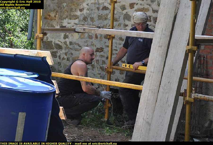… round this morning to see what we were up to and he was soon enlisted in the struggle. Between the three of us we had the scaffolding up in no time. As we found last year when Dave Boustead came for a couple of days, an extra pair of hands can make a considerable difference to the speed at which you can work.